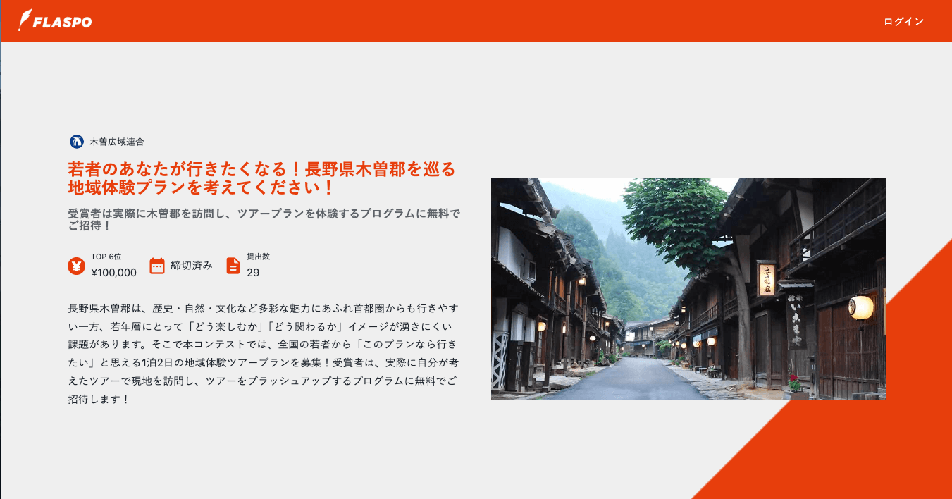 まずは、若者が木曽について興味を持ち、理解し、自分ごと化を促す最初のきっかけとして、木曽郡を舞台にしたオンラインコンテストをFLASPO上で開催。