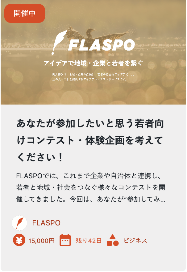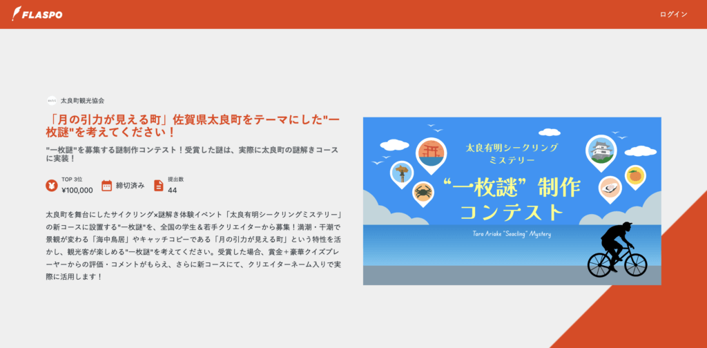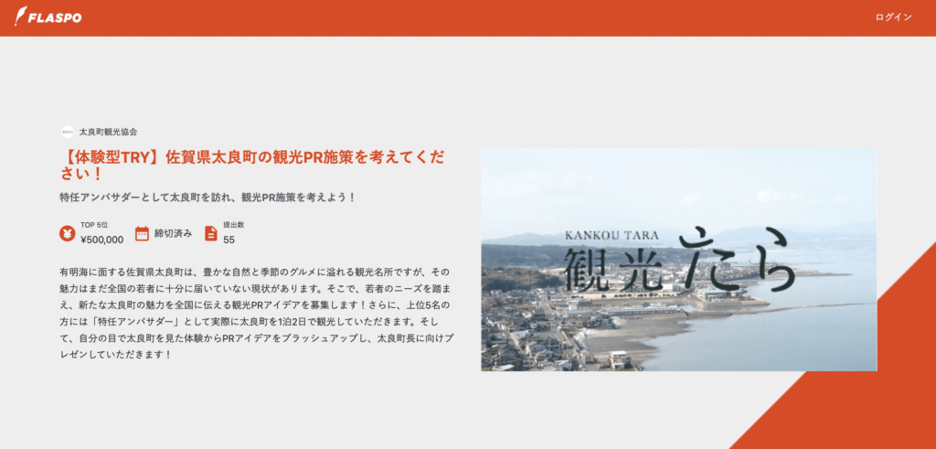 若年層の来訪増加に向けて、「佐賀県太良町にもっと若者に来てもらうには」をテーマに、FLASPOでアイデアコンテストを開催。賞金総額50万円を用意し、全国の学生からアイデアを募集しました。