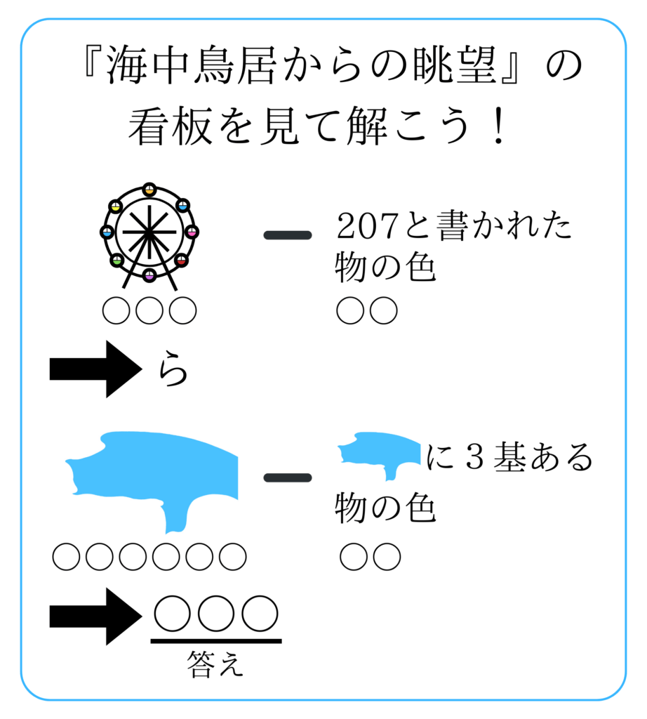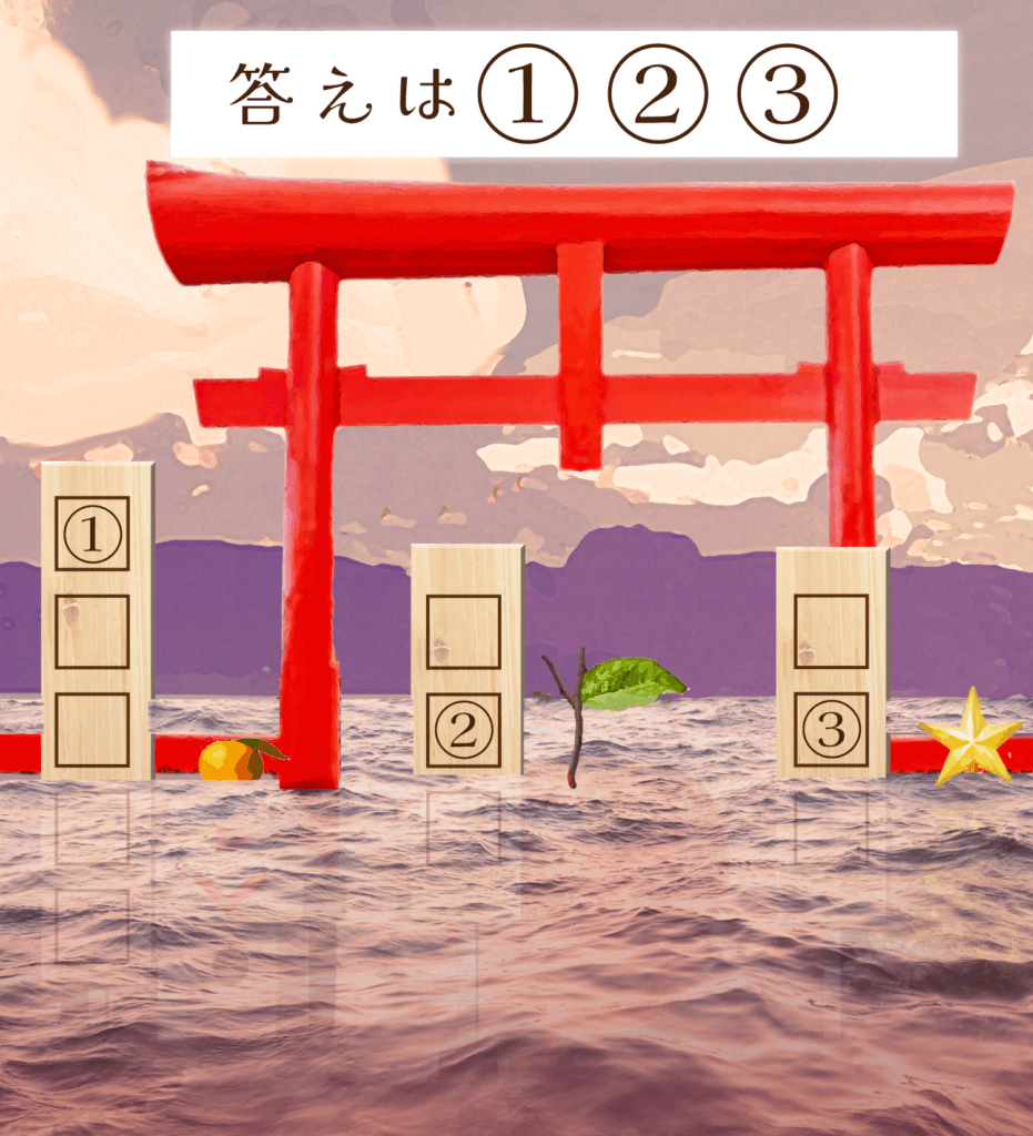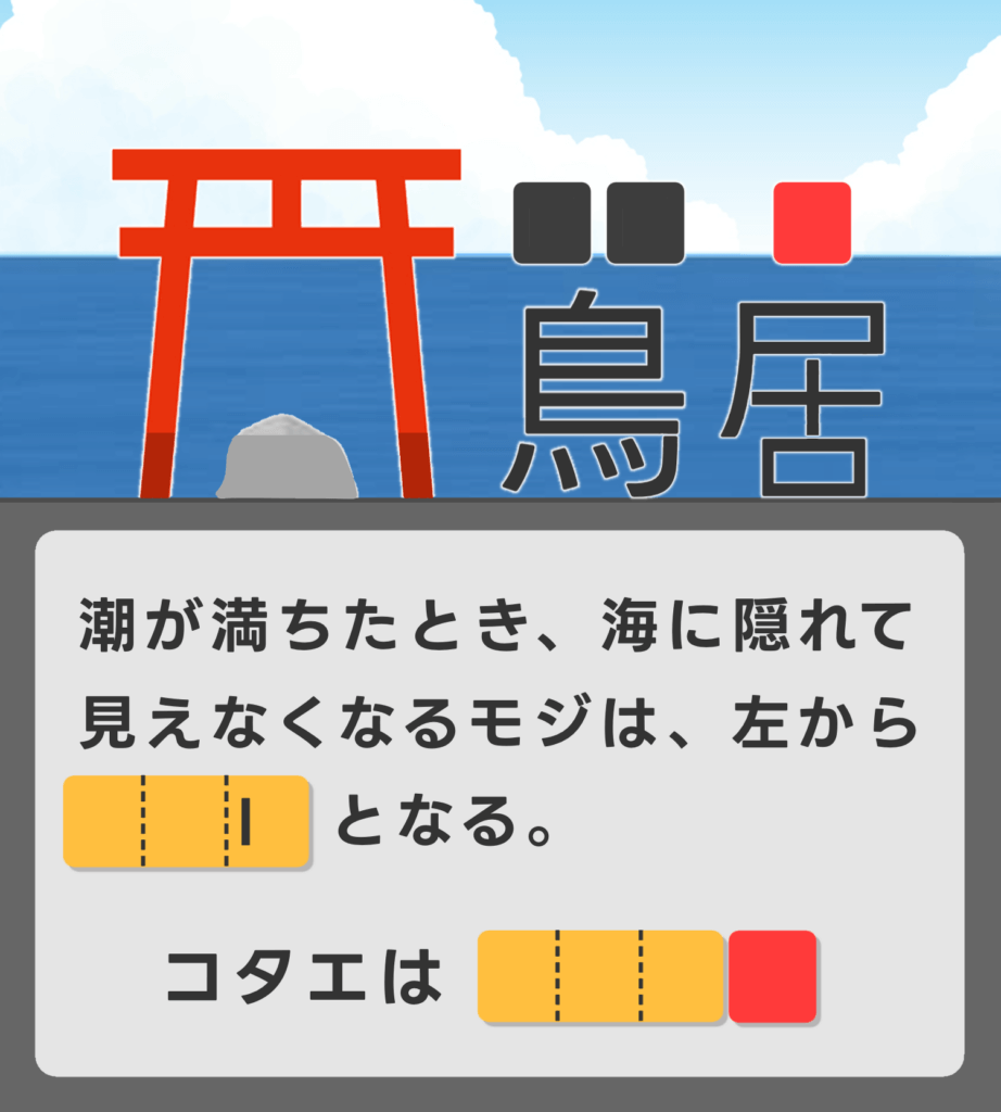 【ヒント3】満潮時に「鳥居」の漢字が隠れそうな部分を観察すると、カタカナの「ハ、●、●」の3文字に見えそうです。