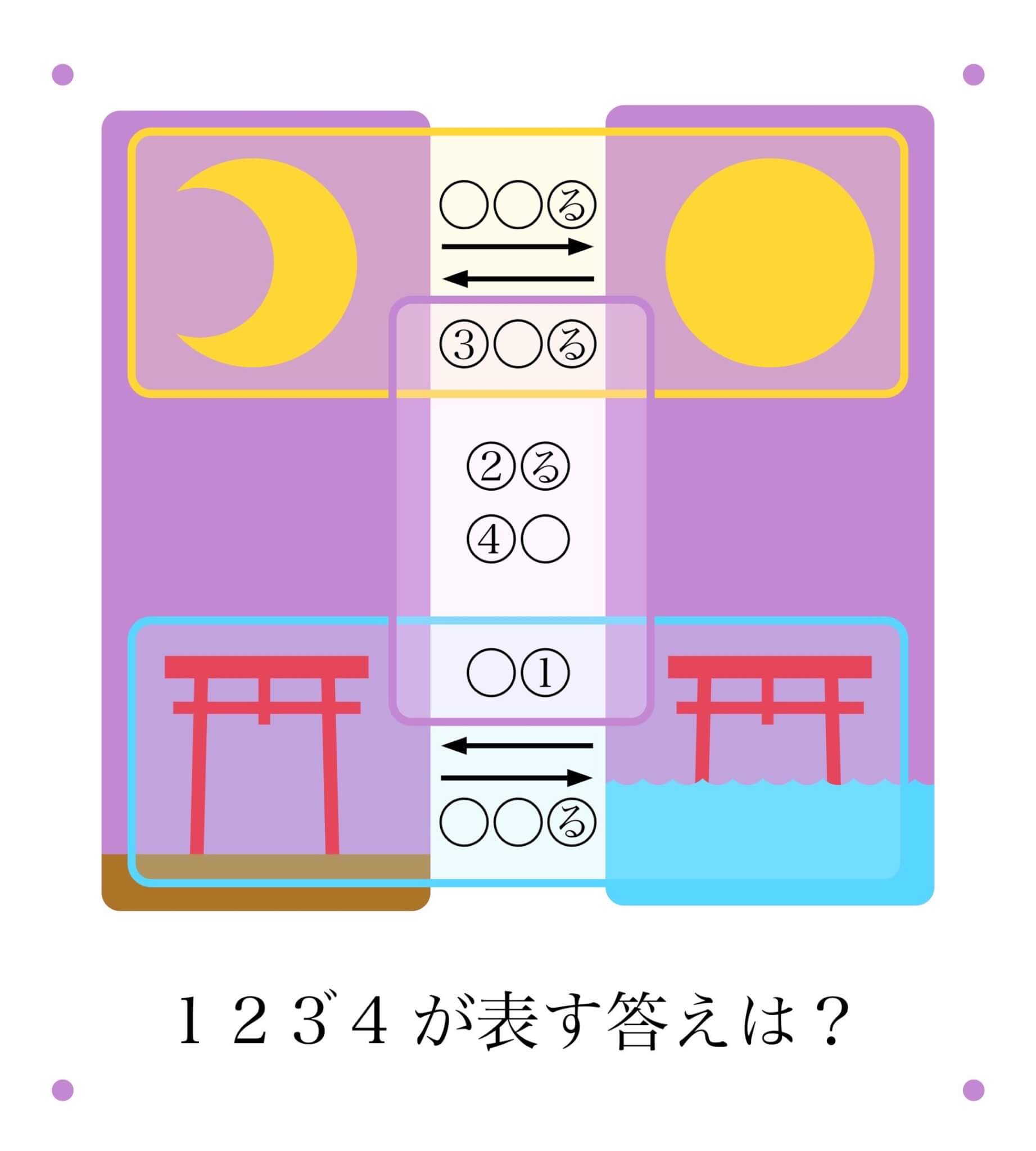 ⑤満潮になると水位が上がり、問題の下の部分が見えなくなってそれぞれのイラストの読み方が変わるようです。また四角の数も減ります。